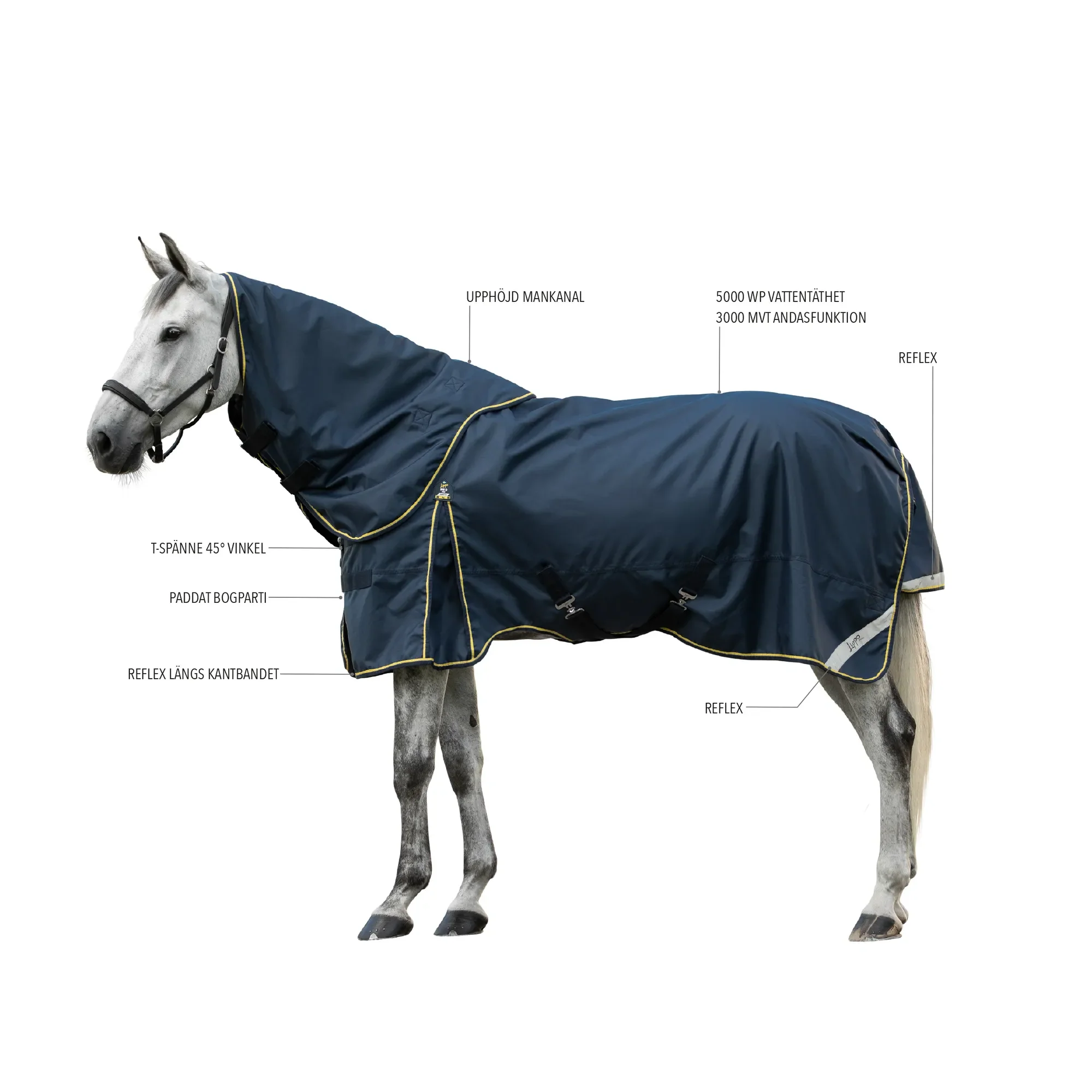 Ett slitstarkt, funktionellt och välsittande hästtäcke för olika väder. Tillverkat i kraftig 900D oxfordväv med smutsavvisande yta, har detta täcke en vattentäthet på 5000 WP och andasfunktion på 3000 MVT – en pålitlig kombination som håller hästen torr och bekväm även vid tufft väder. Passformen är noggrant utvecklad för att ge god rörelsefrihet och hög komfort. Dubbel frontknäppning med extra stark kardborre i nylon. Dubbla bogspännen där det övre spännet är ett T-spänne i 45° vinkel. Anatomiskt placerade kryssgjordar, bogveck och fästen för bensnören ger ett säkert och stabilt täcke som sitter på plats. Det lätt paddade bogpartiet ger extra stöd och minskar risken för skav. Det avtagbara halstäcket har en skyddande och upphöjd mankanal som minimerar slitning på manen. Detaljerna är genomtänkta: reflexband längs kantbandet och baktill på svanslappen ökar synligheten i mörker. Täcket har en elastisk, plastad och avtagbar svansrem – lätt att rengöra. Insidan är fodrad med glansigt, ventilerande foder och har en värmande polyesterfyllning. Storlek: 125, 130, 135, 140, 145, 155, 165 cm